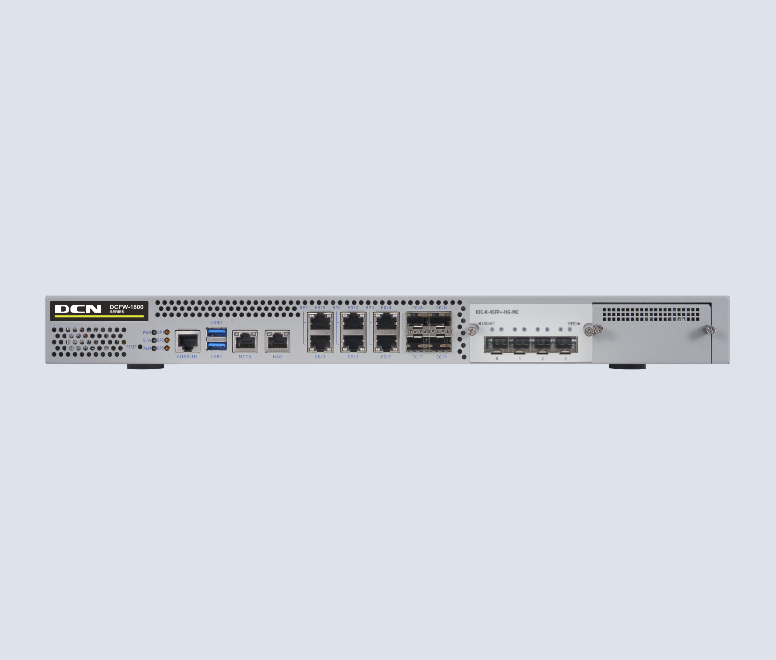 DCFW-1800-N4116-G 物理参数:标准1U设备,8 × GE(2对Bypass)4 × SFP,4 × SFP+;1个扩展槽,研讨固定单电源;含三年质保、含1年四库升级许可(IPS入侵防御特征库、AV病毒过滤特征库、QoS流量管理、URL过滤软件。 )。